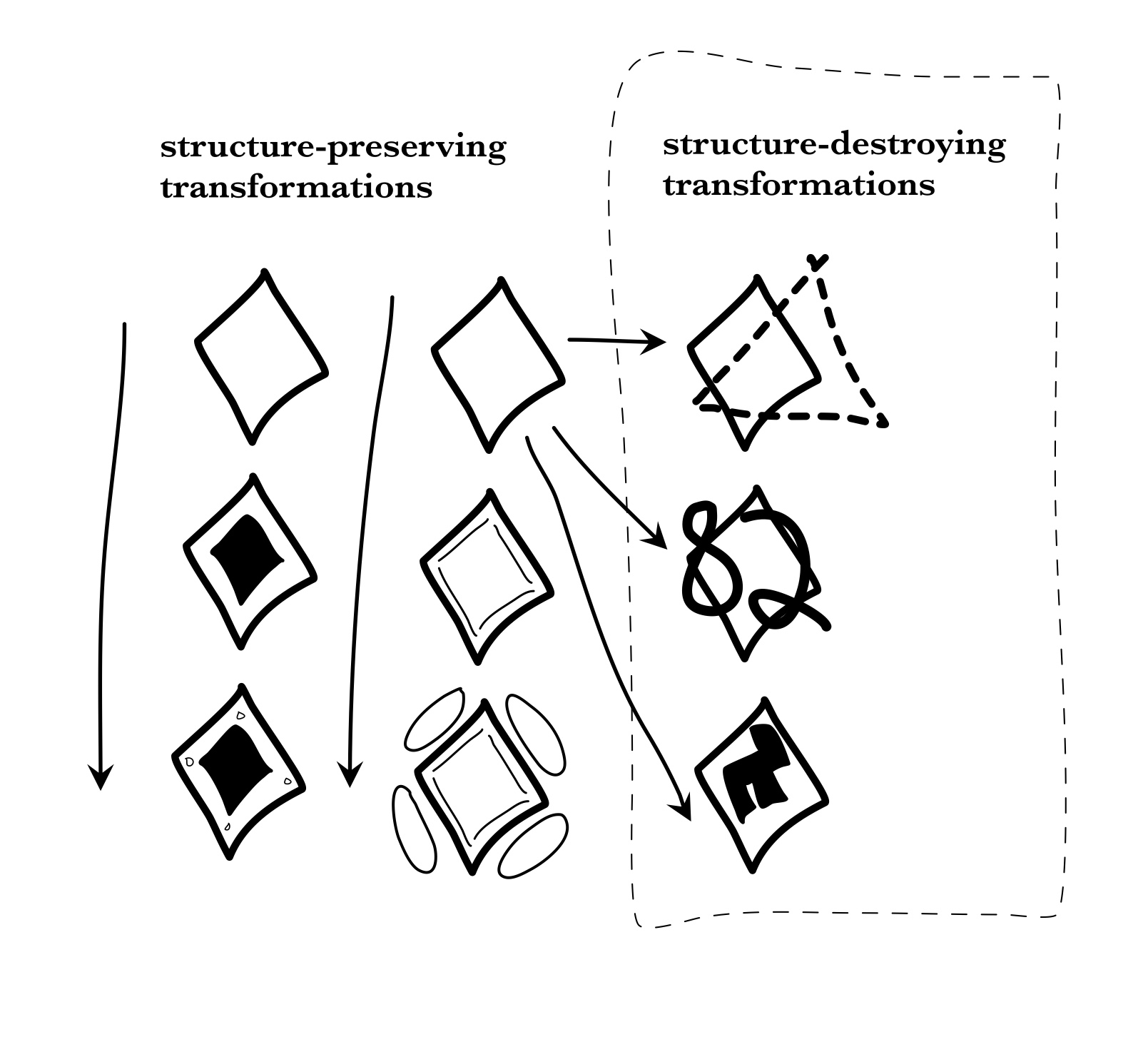 Underneath the universe’s apparent laziness is a deeper laziness: a manner of generation that preserves existing structure. A “structure-preserving transformation” does not impose arbitrary (conscious, legible) order on the system, but takes its cue from the existing structure, and elaborates and strengthens it. One of Christopher Alexander’s terms for this is “the unfolding of wholeness” - but here a picture will do better than words. Below, the diamond shape forms the basis for subsequent transformations. In the two left columns, the diamonds are subjected to transformations that strengthen and emphasize their shape, then to transformations that build off of that new whole, preserving and elaborating the new structure in a lazy but rather effective way. In the column on the right, the diamond is subjected to structure-destroying transformations that impose new, incompatible order and detract from, rather than strengthen, the original structure.The structure-destroying transformations are recognizable as mess: competing orders don’t allow for a coherent, harmonious whole. They are not peaceful to look at, and further attempts at structure-preserving elaboration will only “preserve” an ugly, messy structure. On the other hand, simple as they are, the structure-preserving transformations have a bit of quiet ease. You can imagine going on like that, adding dots here and lines there, just as needed, until it is quite elaborate. As long as each transformation preserves the underlying structure, it will retain its wholeness and beauty. They are not based on any pre-existing image; rather, they are “easy, natural steps which arise from the context (ibid. p. 439).” Even decay can be structure-preserving, when the decaying structure was produced by this process: decay reveals underlying levels of organization that are attractively harmonious, because they formed the basis for the elaboration of the whole (e.g. bones, shipwrecks).