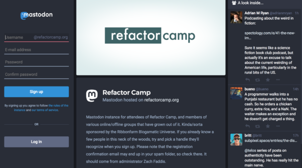 As many of you already know, for the last few weeks, we've been running a Mastodon instance at refactorcamp.org on a pilot basis, kicking the tires and figuring things out. The requisite technical wizardry is being volunteered by Zach Faddis.