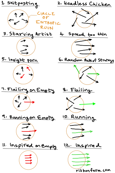 Interestingly, this diagram (and therefore this post) itself began life as a twitter shitpost doodle, and then it evolved in quality to become level-5 insight porn. The key idea that leveled it up was that of the circle of entropic ruin.