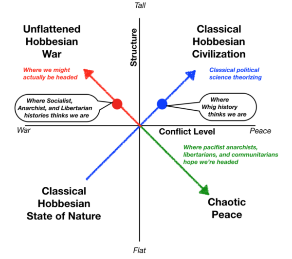 Ursula LeGuin's contrasting pair of worlds in The Dispossessed, Anarres (anarchic, flat peace) and Urras (orderly, tall brink-of-Hobbesian-war) illustrate specific imaginings of simpler top-left and bottom-right states. Techno-utopian visions tend to the top-right condition. You can plot your favorite science fiction worlds on this diagram. Try Asimov's various worlds and Iain M. Banks' Culture world for some fun.