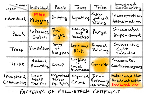 You may not agree with my specific categorizations, or my particular taxonomy of levels, but I hope the logic is clear. You basically take the model of the societal stack and plot its levels along both the rows and columns of the matrix. So our 5-level stack yields 25 categories of conflict patterns (if we distinguish winning and losing actors for every unlike pairing).