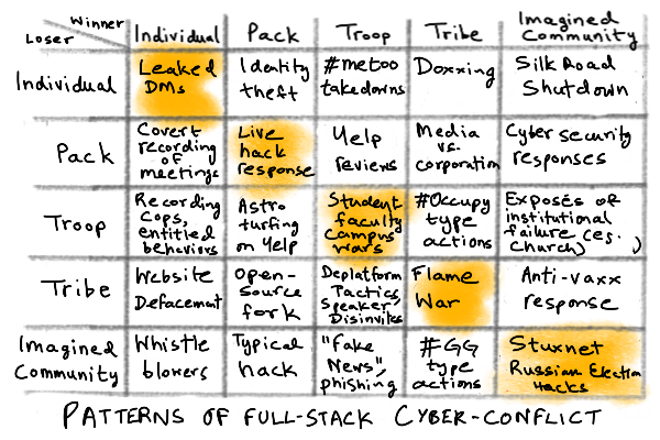 The more advanced the technology, the more unflattened patterns of conflict can continue indefinitely without threatening the stack itself. With software eating the world, this becomes even easier, since continuous cyber-conflict can be conducted with low damage to physical built environments, but high damage to psyches and well-being. Here is my matrix of cyber-conflict examples.