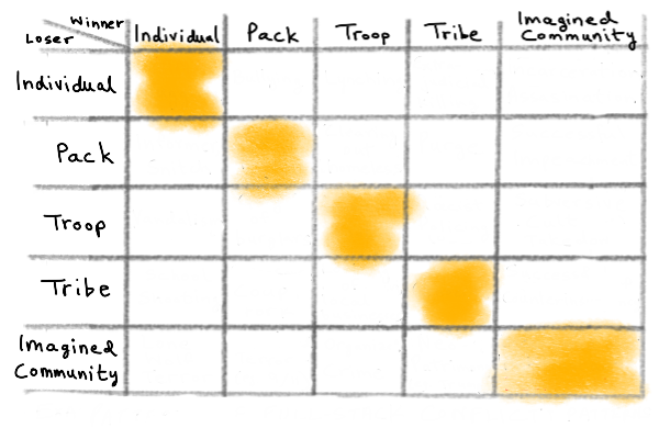 Last week, in Pack Experience, I proposed a model for the societal stack consists of five levels: individual, pack, troop, tribe, and imagined community, and argued that the pack level, rather than the individual level, is foundational.