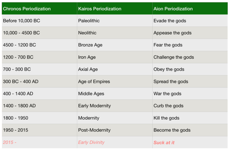 Periodization, of course, is something of a parlor game for amateur historians like you and me. Real historians are going to hate this anyway, so we might as well have fun with it. Here's my meta-theory of Aionic periodization that yielded this label for our age, and a preview of what godly things are in our near future.
