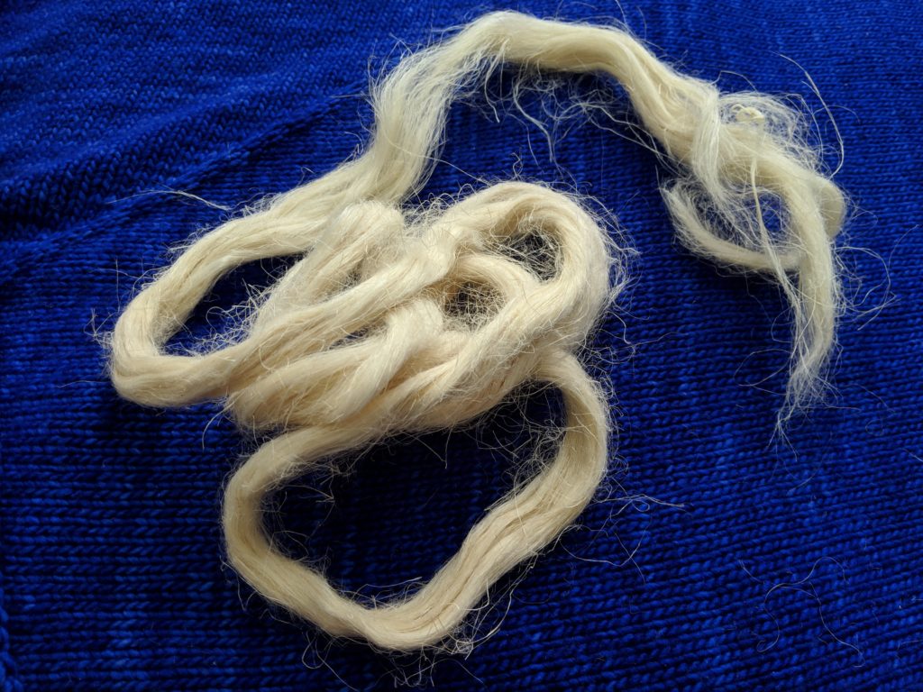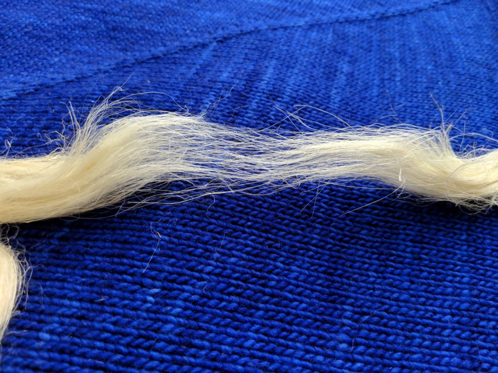 This is because the individual fibers are less than ten inches long, and easily slide by each other when not twisted. A “rope” made of this kind of roving would be useless to tie anything. However, if you take a bit of the fiber and twist it with your fingers, the resulting string can take quite a bit of tension.