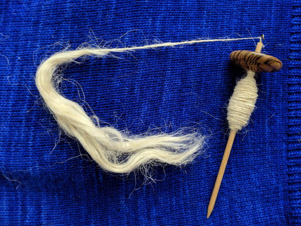 There is a dramatic moment in spinning, when one is familiar with the slippery nature of the roving and can’t quite intuit how the twist will affect things, when you entrust the weight of your spindle to the nascent yarn. If the yarn is not spun tightly enough throughout its length, it may break, as illustrated above, and the spindle will fall. If the yarn is spun properly, though, the spindle will spin suspended on the thread, strengthening it as it is lengthened. Spinning wheels and industrial spinning machines operate on the same principle: adding fiber and twist at the same time to lengthen the existing thread.