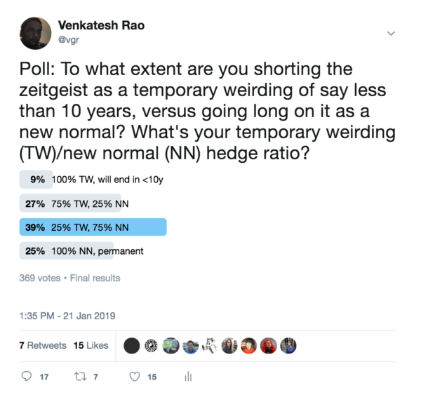 I did a little poll asking people the extent to which they are treating the current zeitgeist as a temporary weirding (TW) versus a permanent new normal (NN).
