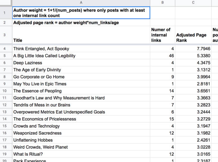 And here's the spreadsheet with the mined data. Feel free to make a copy and play around with the data and my PageRank-esque formula, which generates this view of the archives: