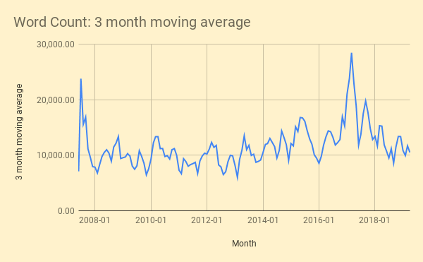Last time, we took an content graph view of this elderblog. Now let's take a word-count view. There is something pleasantly honest about word counts. They strike a thoughtful balance between weighing writing in too-literal (compressed file sizes) and too-abstract (post count) ways. Ribbonfarm has averaged 11,491 words/month over its 11.5 year history.