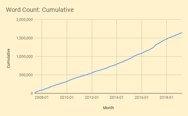 The two spikes in 2007 and in 2017 are explained by me flushing out a pile of private drafts when I started, and the publishing of the longform course participant essays respectively. The steady accumulation is even clearer in the cumulative word-count graph:
