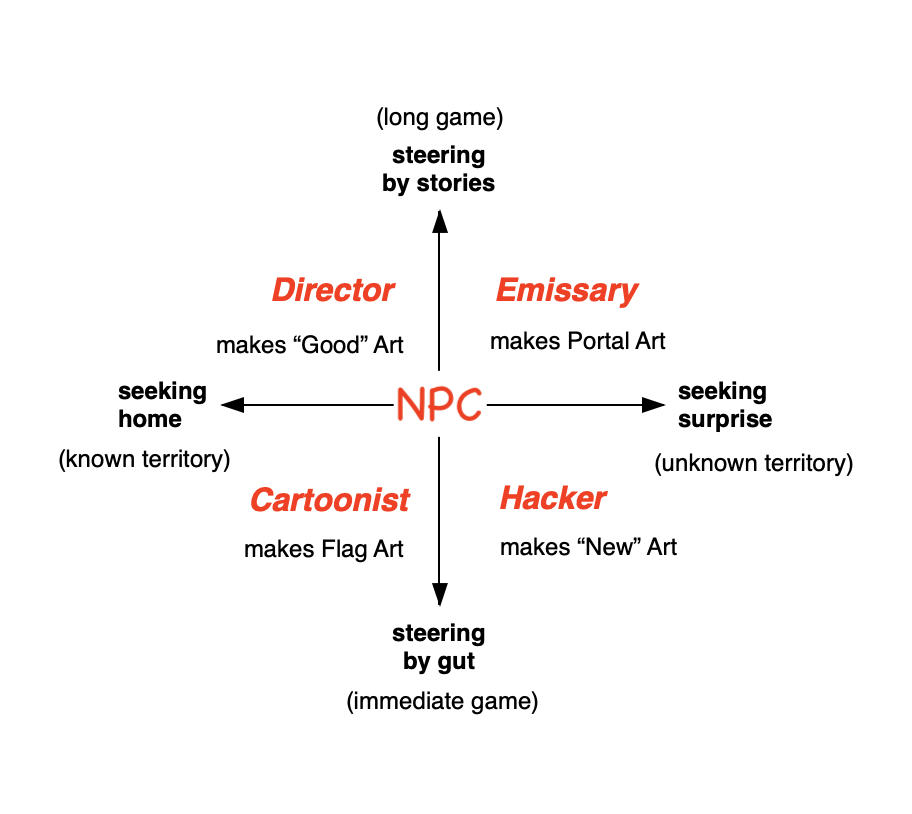 That's what it means to be an NPC: non-playing or non-playable character. An archetype who anti-waits while history happens around it. Not a hacker, cartoonist, directory, or emissary. A non-player at the center of Ian's 2x2. Here's my mod: