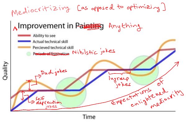 Taken together, the two provide a usable map and compass for a praxis of mediocrity. A map of the territory (emotional roller coaster of open-ended growth), with a depiction of a subjective path through it (modes of humor that work as coping mechanisms for each regime), and a compass to guide you through it (non-attachment to particular peaks or troughs, which are the wins and losses you must look past to continue the game).