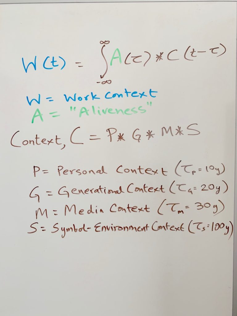 I often make up pseudomath equations to help me see the structure of an interesting question, even if it's unlikely that there's any actual interesting mathematical structure there. Here's my pseudo-math attempt to model the idea of "work in context" (blue) as a convolution of aliveness (green) and general environmental context (brown).