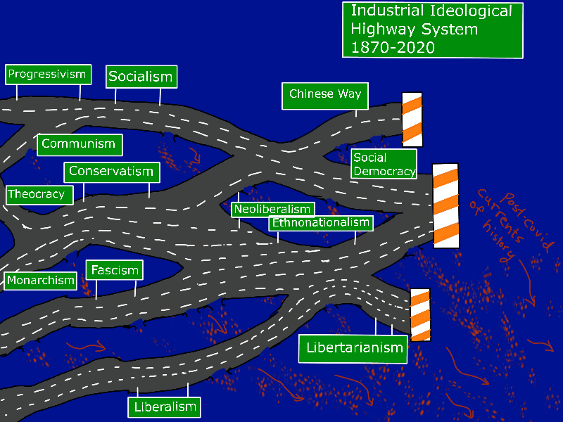 Here’s a way to understand our present condition: the entire ideological highway system has run into an end-of-evolution barrier. History may or may not have ended, but this particular globally shared experience of historical time has at least dead-ended. That's why the metaphor of a before/after corona watershed event is so compelling.