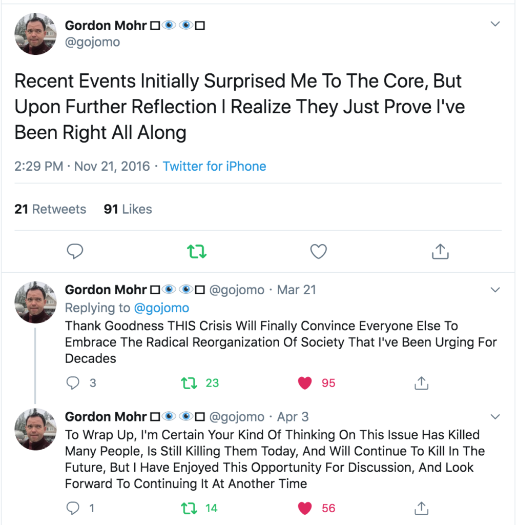 I have been using Gordon's thread as a canned reply to sanctimonious people on Twitter who have taken to preaching annoying sermons founded on the presumption that their forecasts have come true, that their values have been fully vindicated, and that their preferred future is obviously just around the corner. Covid19 presents a confirmation bias feast for all willing to studiously ignore the liminality.