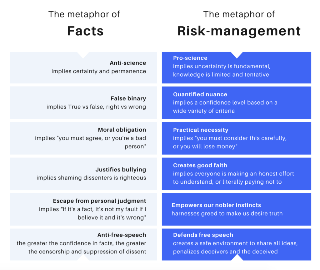 While the metaphor of Facts implies believing today's prevailing opinions is a moral imperative, the metaphor of risk management invites us to weigh the risks of being mistaken against the rewards of being correct.