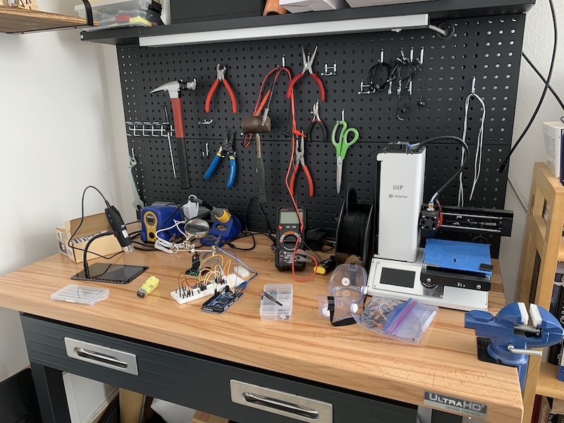 For the past 6 months, I've been doing increasingly complex maker projects (from a low baseline where getting an LED to blink felt like an accomplishment), and slowly buying equipment and supplies along the way, in the process building out this workbench corner in my home office. It feels like watching a peculiar battery slowly get charged up to its full potential.