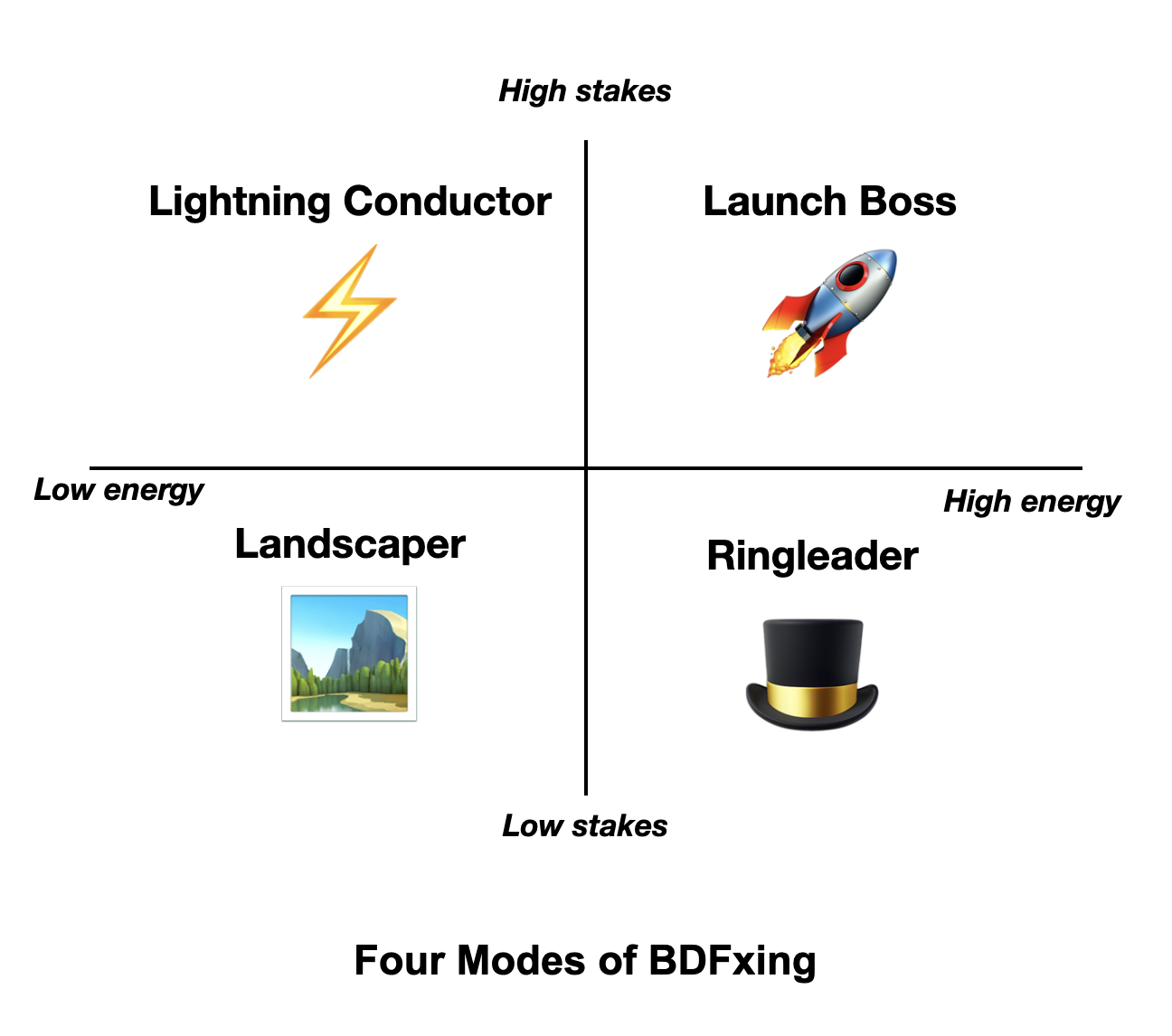 The "size" of a leadership episode could be measured as a product of stakes and energy. Ie, the value of what's at stake times the energy output rate (in the sense of Andy Grove's idea of "high-output management") that needs to be put in for the duration, to make something happen. Here's the 2x2 with the resulting for BDFxing archetypes (which are transient roles, not personalities).