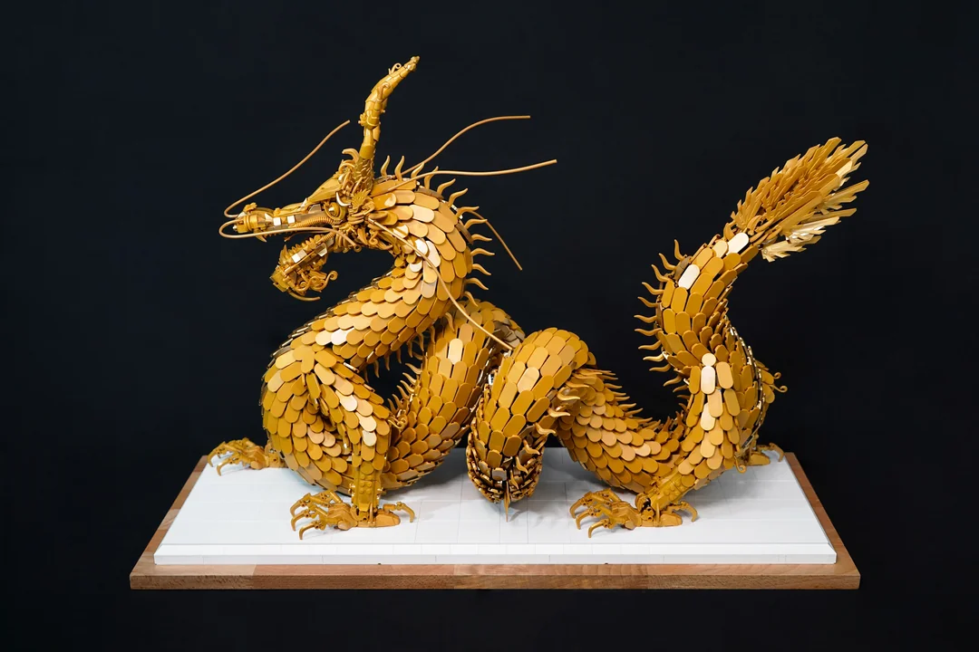 This dragon, unlike the far simpler dragon kits sold by Lego itself, uses a 2x4 oval tile for scales and a set of other parts for creating the curving spine, all from mostly unrelated kits. It's very hard to get Lego parts to do static curves, since the grammar has a strong orthonormal bias due to the mating technique. Chen managed to pull it off:
