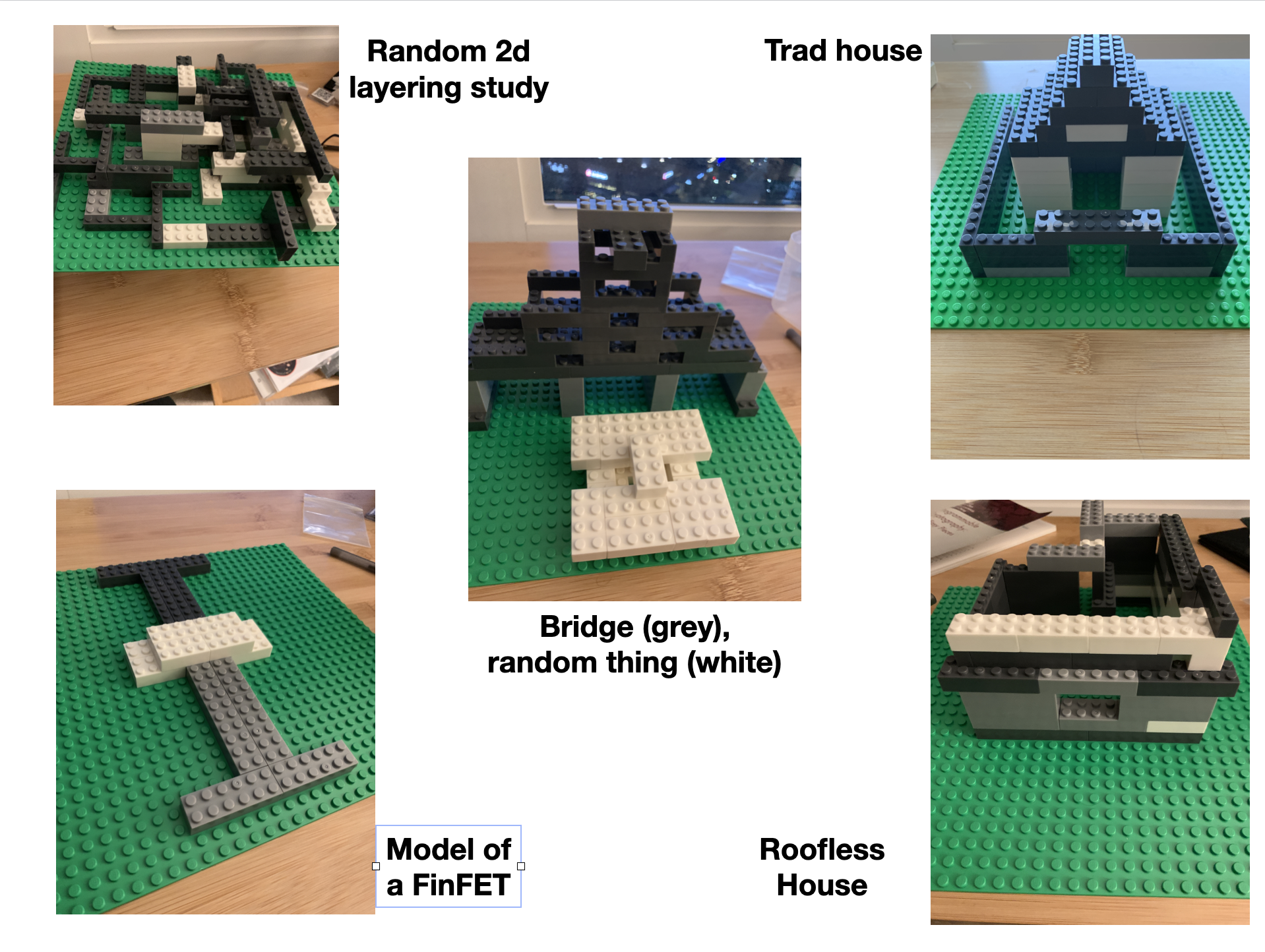 I can follow fairly complex instructions to build models from a kit pretty easily, but faced with a pile of bricks and no plans or goals, I come up with dull designs to build, exhibiting very little imagination and near-zero creativity. Nothing in this collage gets even a passing grade on creativity. The most imaginative thing in the collage below is the model of a FinFET -- a nano-scale feature of semiconductor chips -- at the bottom left. I give it a D+ on imagination because it took a minor leap of imagination to recognize that Legos can be used to model things at scales besides the familiar range of scales covered by Lego models (typically coffee-cup scale to cityscape scale). I had to let go the "habit" of only seeing normal-scale-range design possibilities. But even that minor, barely passing-grade leap felt exciting. I plan to pull out my copy of Open Circuits and model more tiny electronics parts and features.